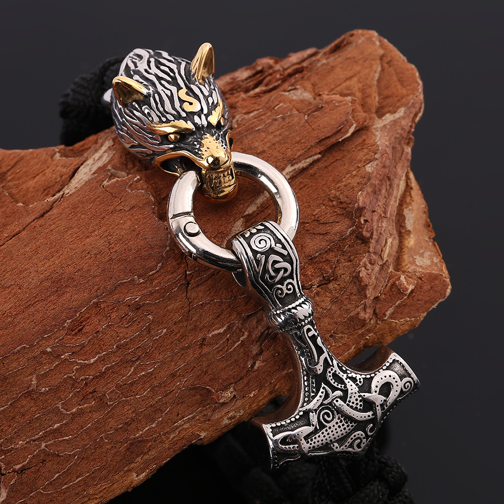 Bratara barbateasca din sfoara impletita, model cu cap de leu si ciocanul lui Thor din otel inoxidabil, placat cu aur 18K, Tessero, argintiu si negru