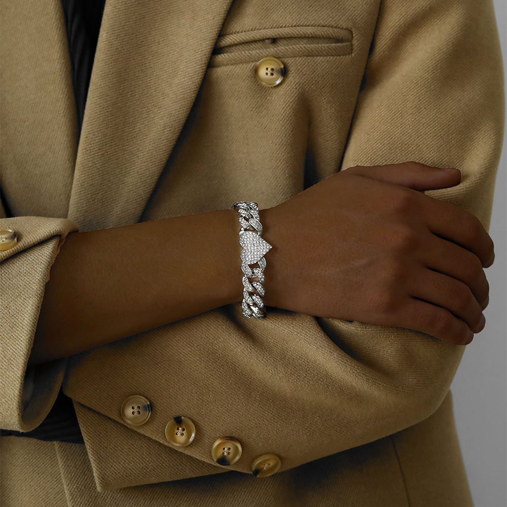 Bratara Cuban Chain cu charm in forma de inimioara, placat cu aur 18K, pietre zirconiu, 13 mm, unisex, Tessero, argintiu