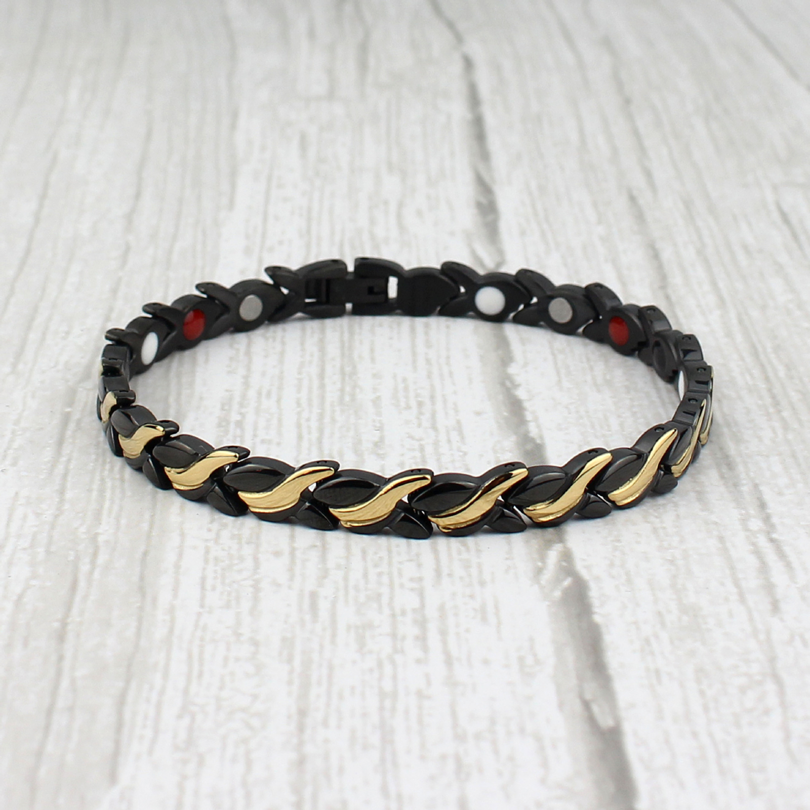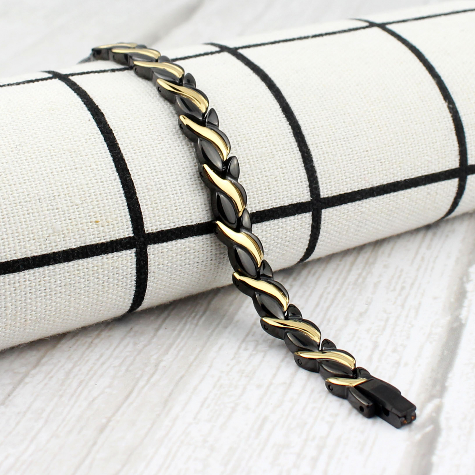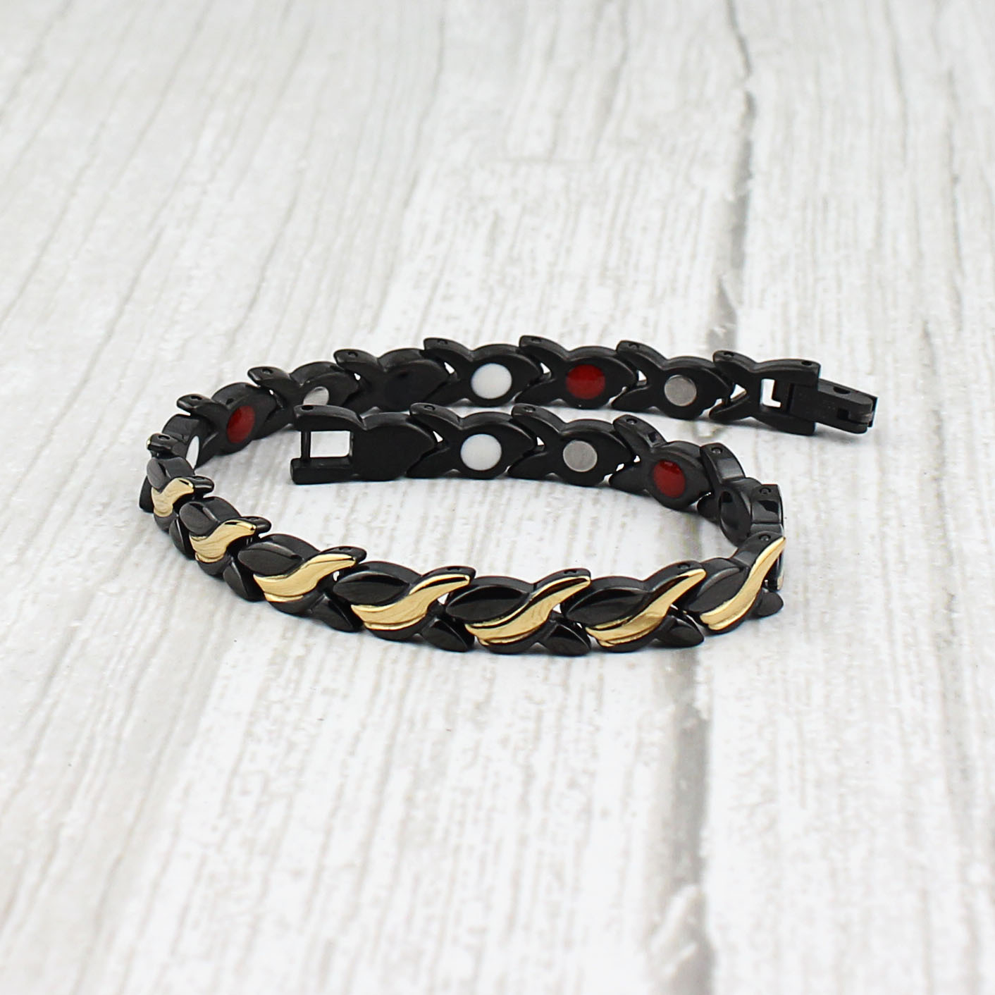 Bratara de dama magnetica si terapeutica pentru o stare de bine si protectie, antidepresie, model in doua culori, otel inoxdaibil, placata cu aur 18K, Tessero, negru si auriu