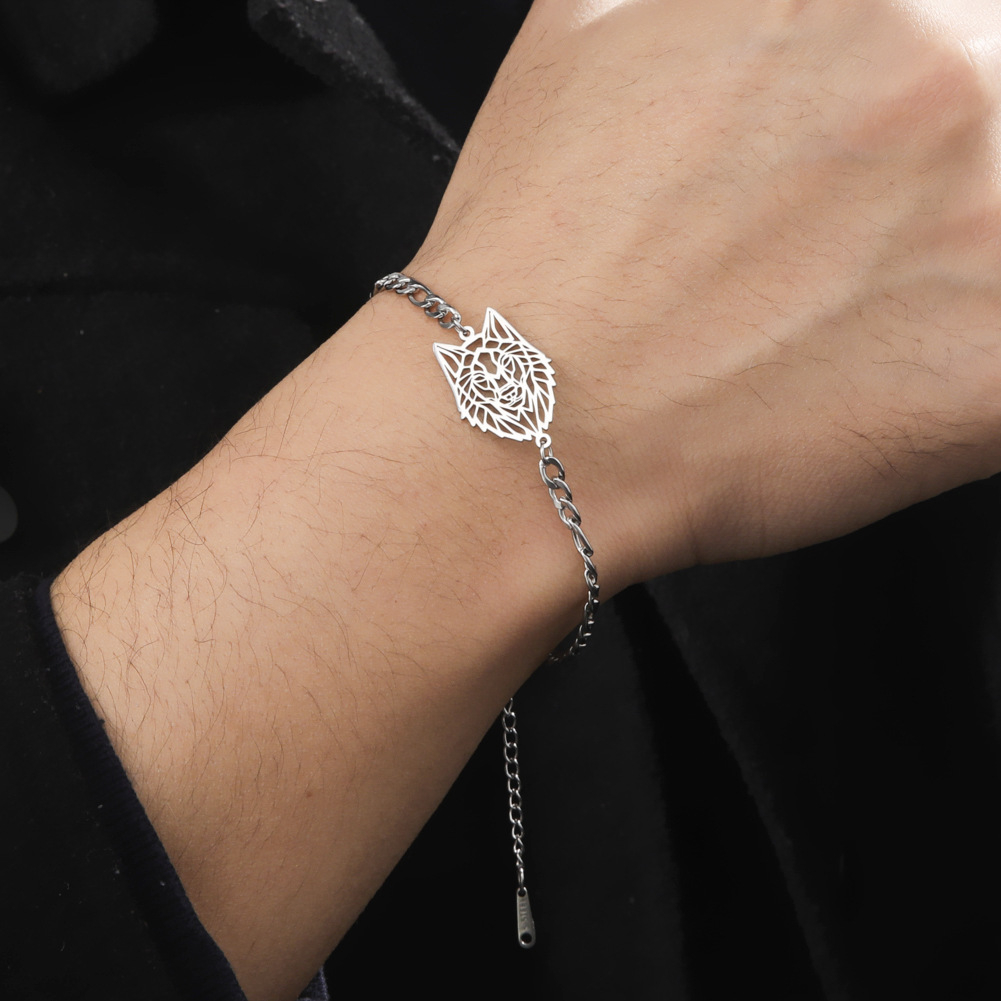 Bratara de mana model Figaro cu cap de lup geometric, placat cu aur 18K, marime reglabila, 17+5 cm extensie, Tessero, argintiu