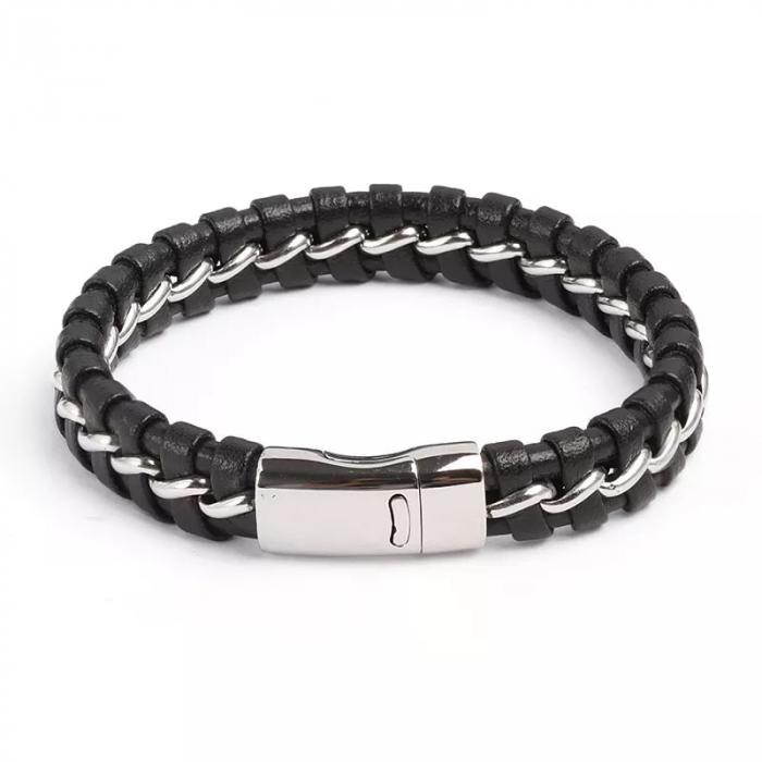 Bratara din piele naturala impletita cu otel inoxidabil, prindere magnet, 19 cm, placat cu aur 18K, Tessero, argintiu