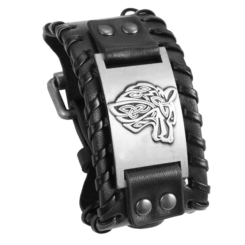 Bratara din piele naturala impletita cu placuta model gravat in forma de lup, inchidere tip curea, marime reglabila, lucrata manual, Tessero, negru