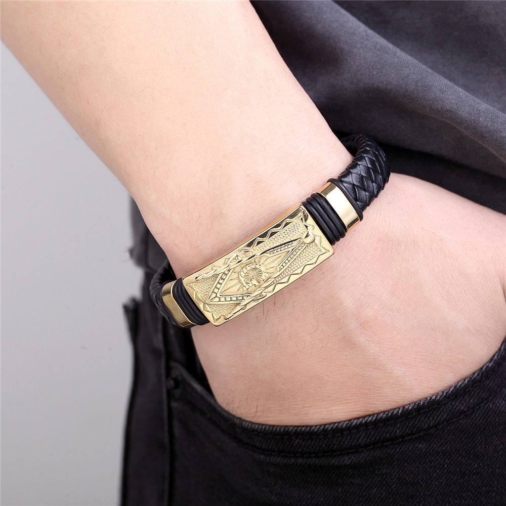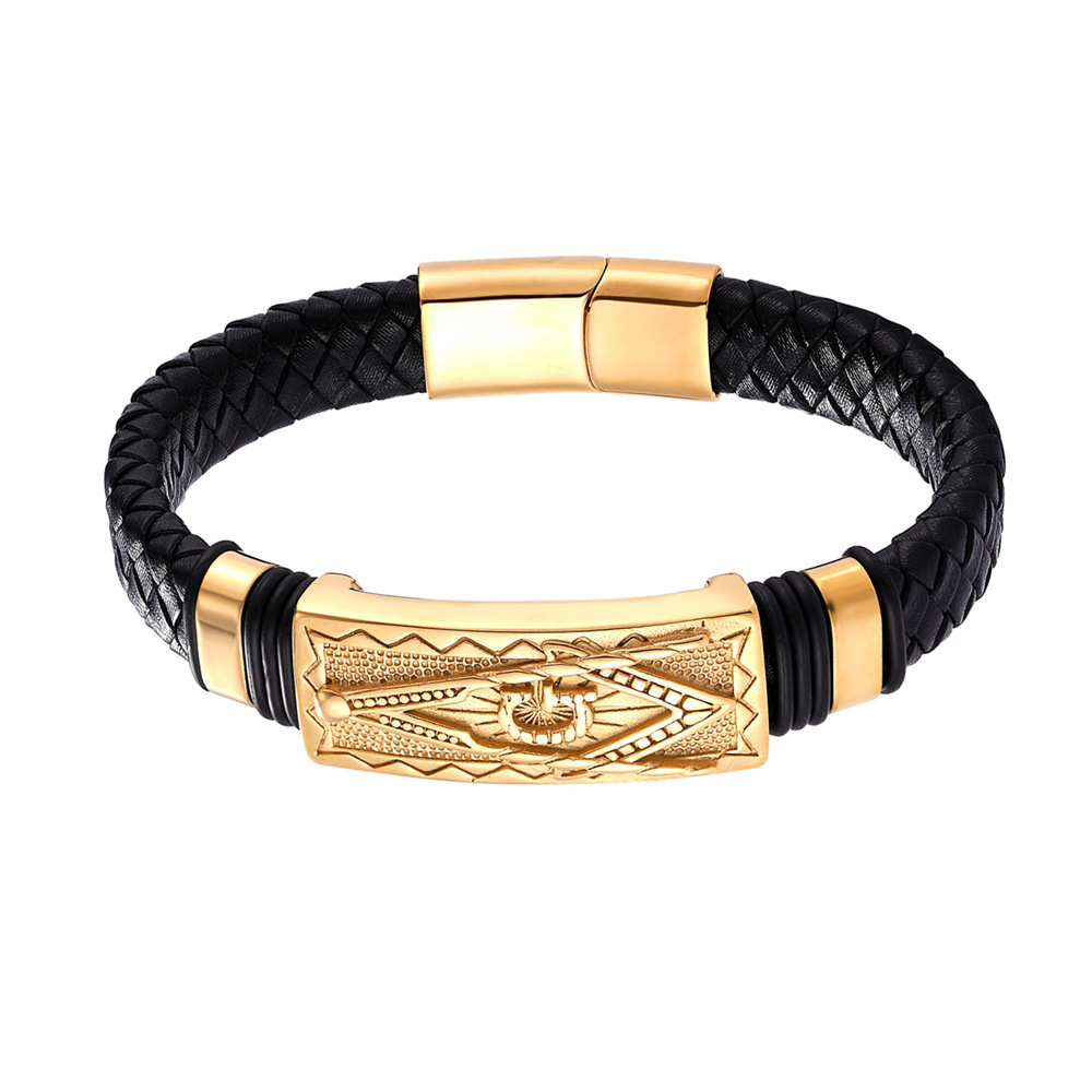 Bratara din piele naturala impletita, model cu semn Masonic in forma de echer si compas, prindere magnet, Tessero, negru si auriu