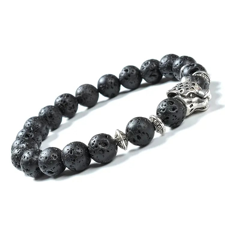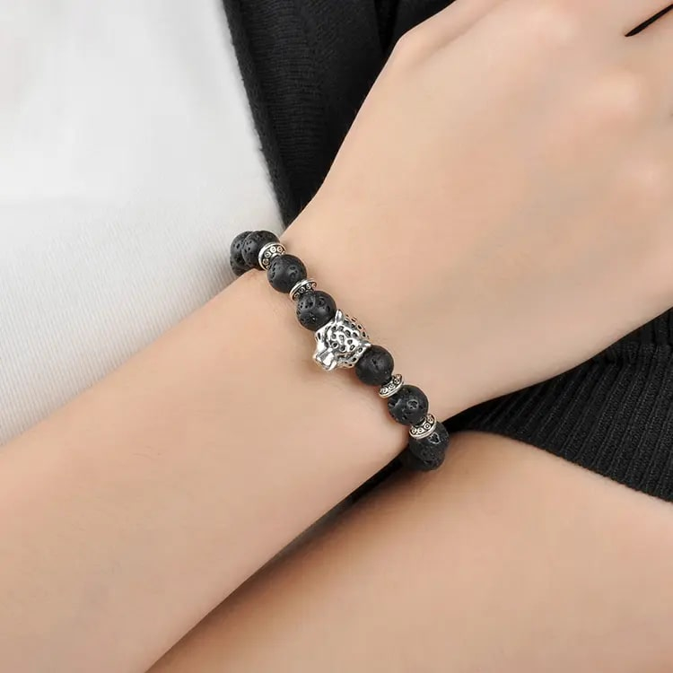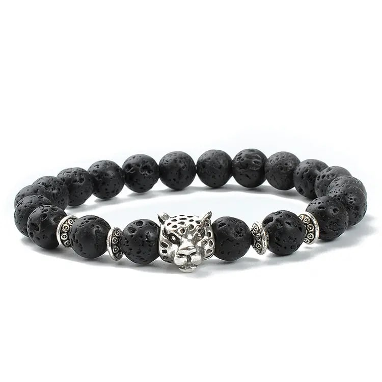 Bratara elastica din roca vulcanica, charm-uri placate cu argint, model cu cap de leopard, unisex, Tessero, negru