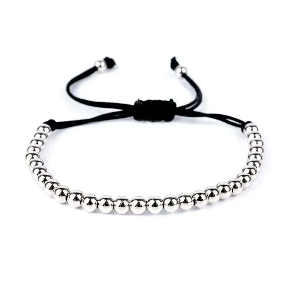 Bratara realizata manual din bilute si snur, model stil macrame, marime reglabila, unisex, placata cu aur 18K, argintiu