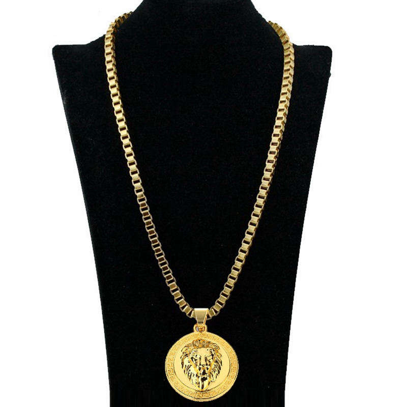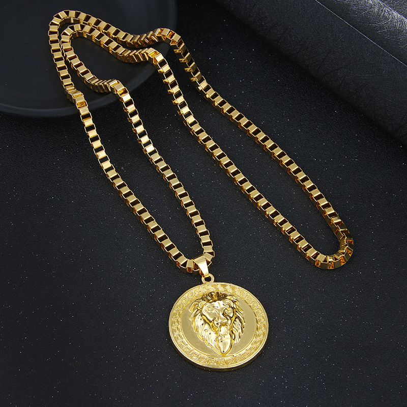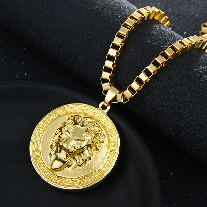 Colier lant cu pandantiv cap de leu, placat cu aur 18k
