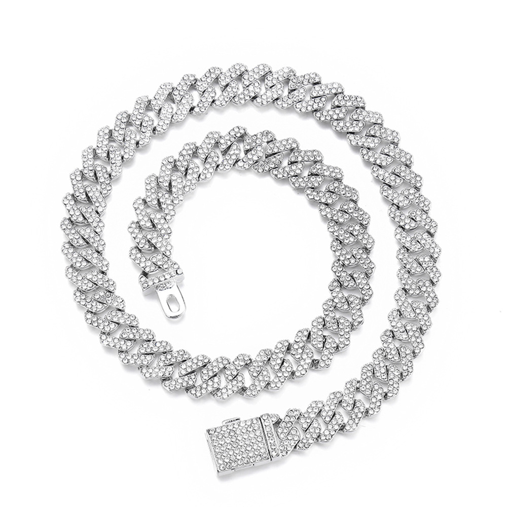 Lant Cuban Chain design cubic din otel inoxidabil, placat cu aur 18K, inchidere cu catarama, pietre zirconiu Tessero, argintiu