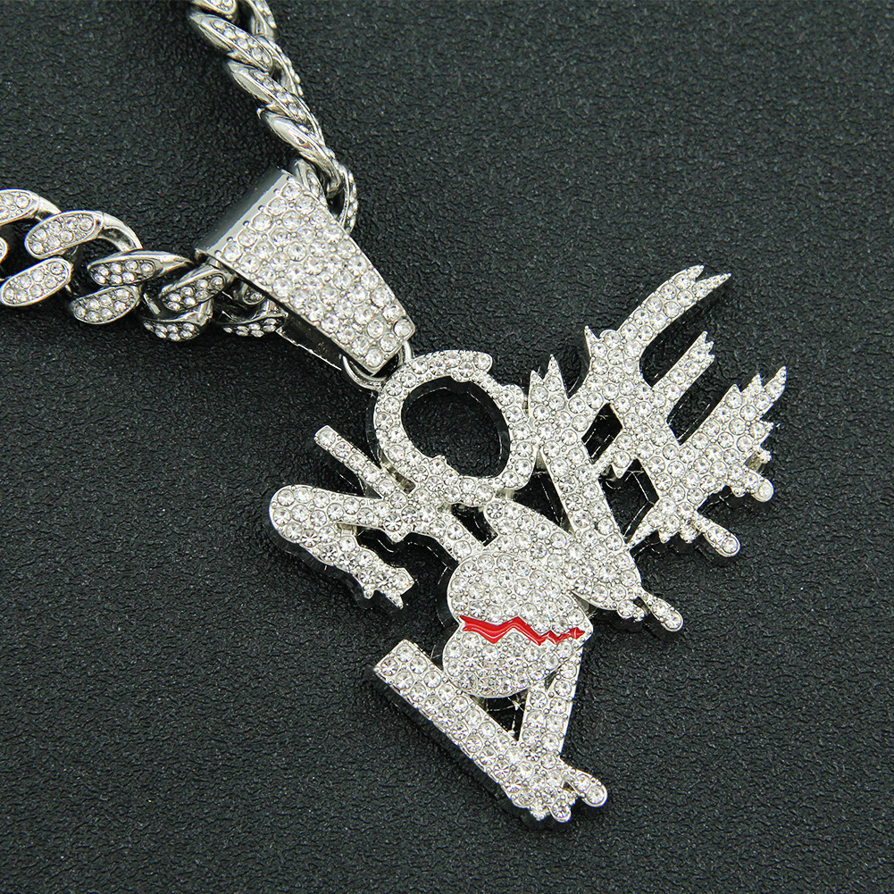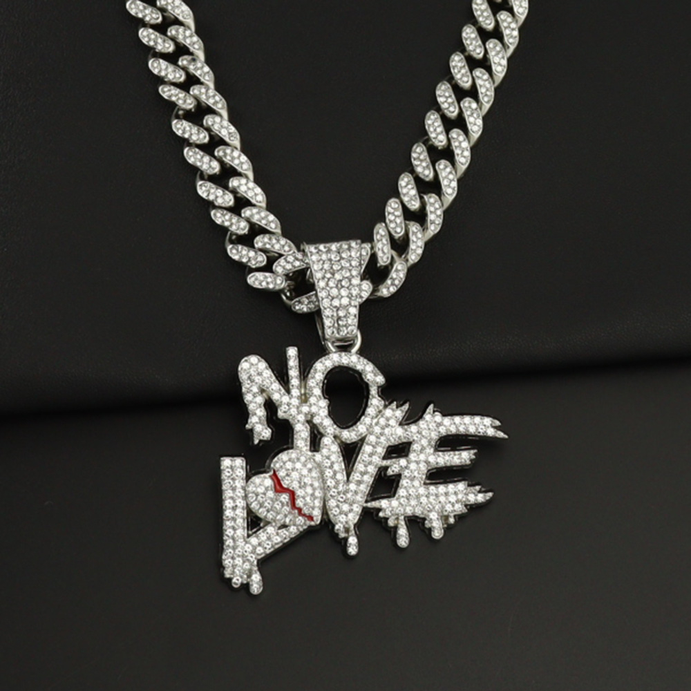Lant Cuban Chain Iced Out cu pandantiv " No Love '', placat cu aur 18K, pietre zirconiu, inchidere tip catarama, Tessero, 50 cm, unisex, argintiu