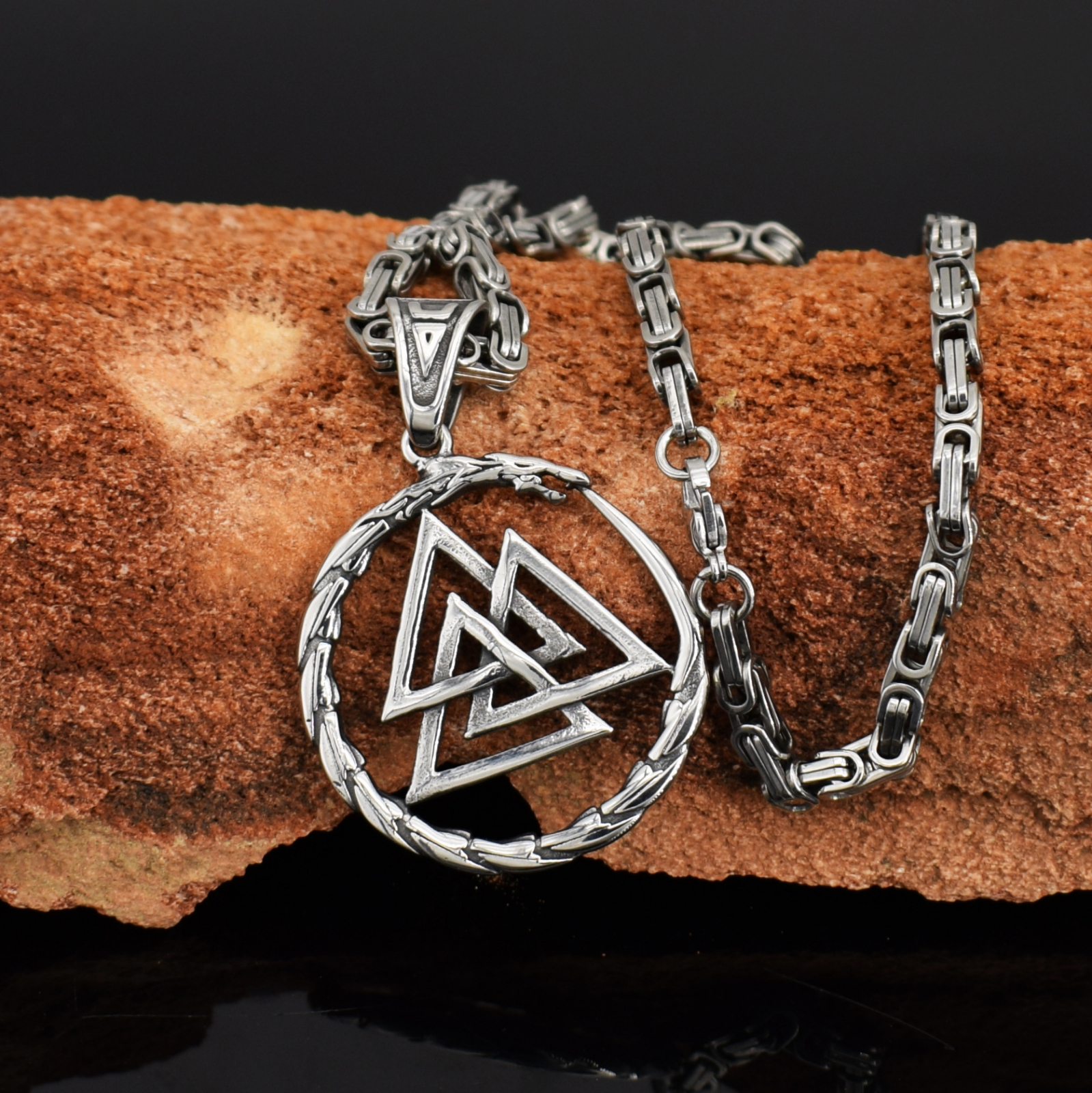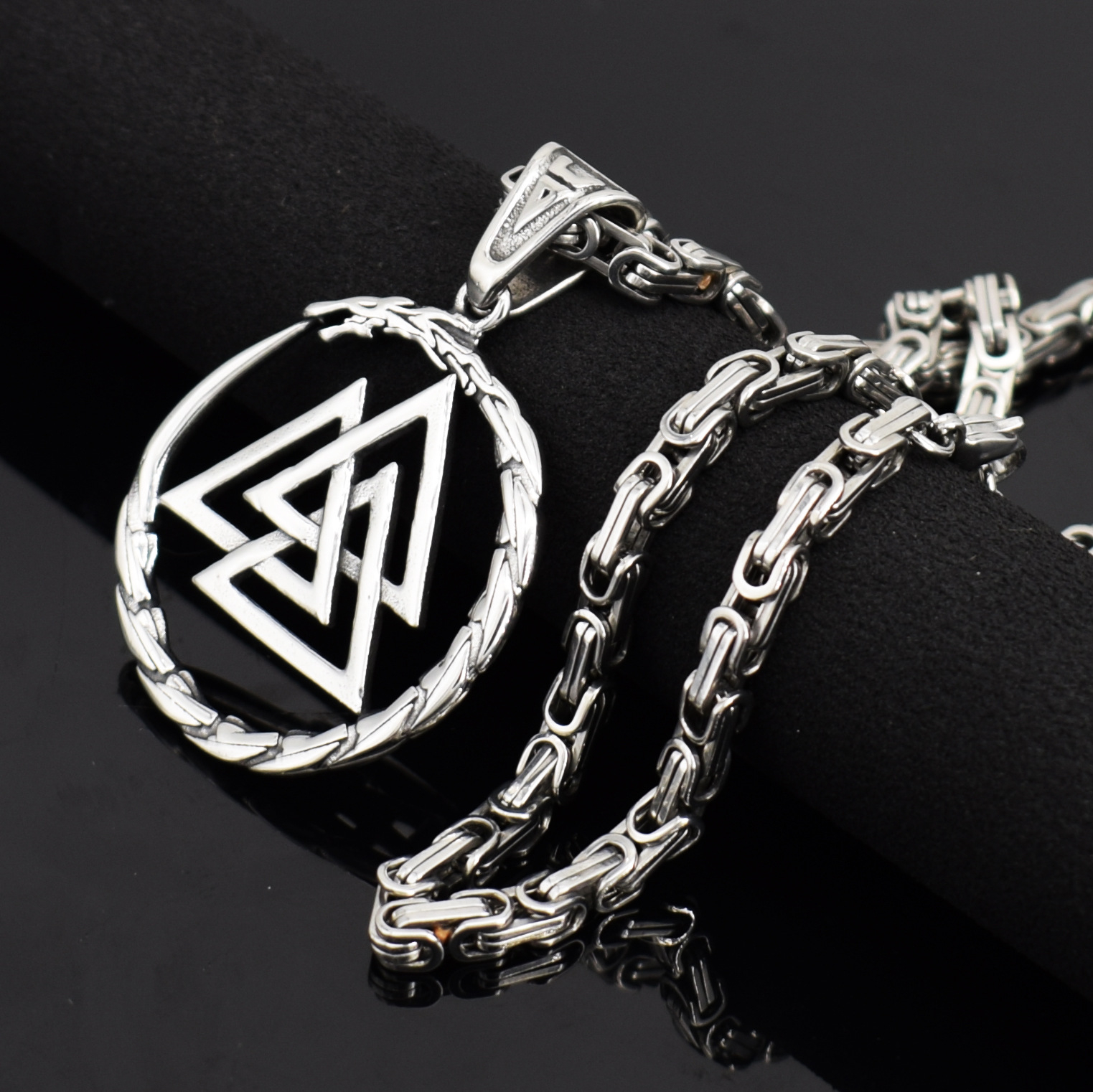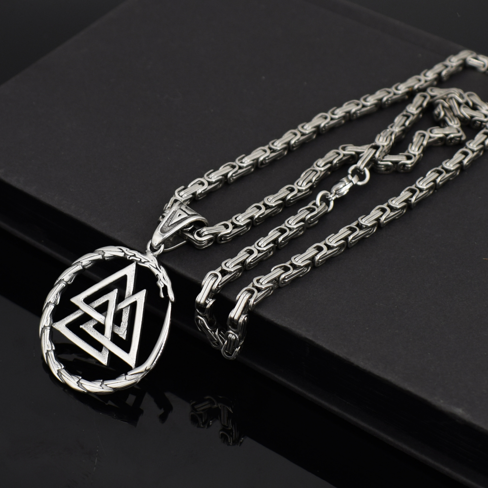 Lant model Byzantine cu pandantiv Viking cu design triunghiular, otel inoxidabil placat cu aur 18K, Tessero, argintiu