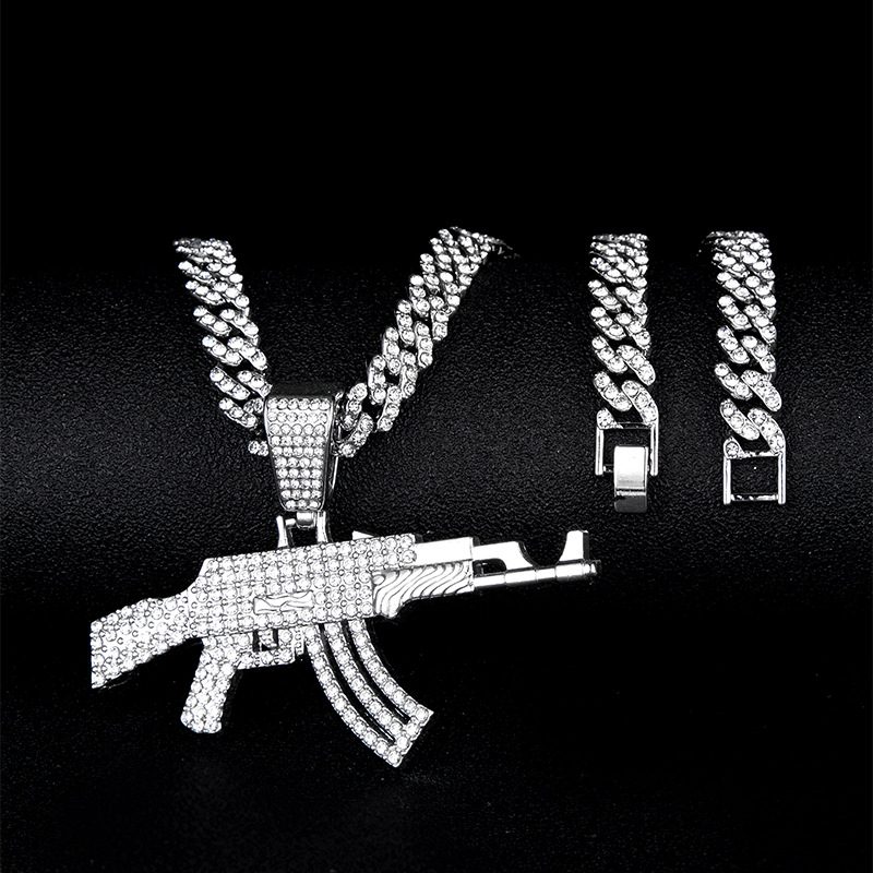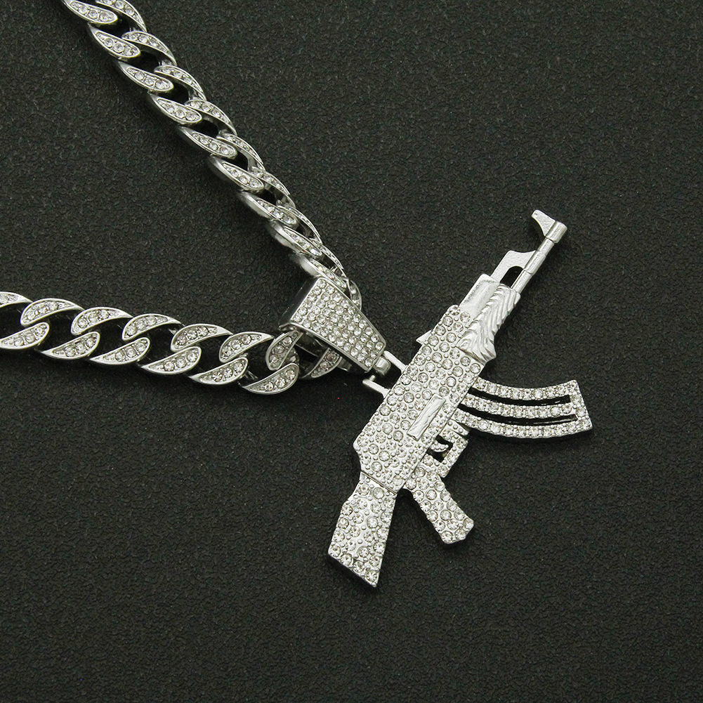 Lant model Cuban Chain cu pandantiv Hip Hop Iced Out in forma de pusca AK47, pietre zirconiu, placat cu aur 18K, unisex, 50 cm, Tessero, argintiu