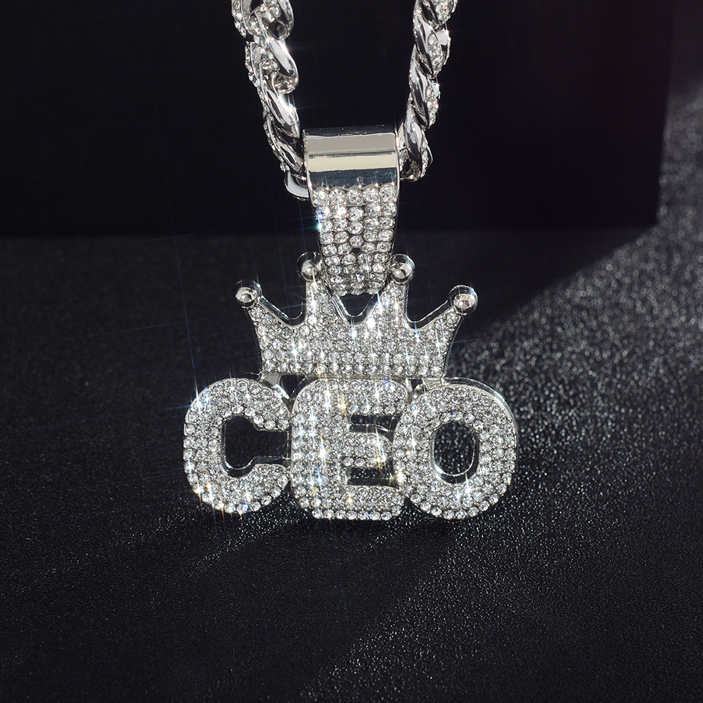 Lant model Cuban Chain cu pandantiv Hip Hop Iced Out inscriptionat CEO, director executiv, pietre zirconiu, placat cu aur 18K, unisex, Tessero, argintiu