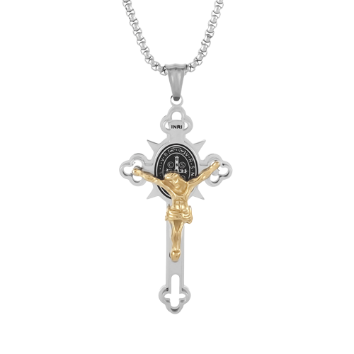 Lantisor barbatesc cu pandantiv in forma de cruce cu Iisus Hristos, otel inoxidabil, placat cu aur, Tessero, auriu