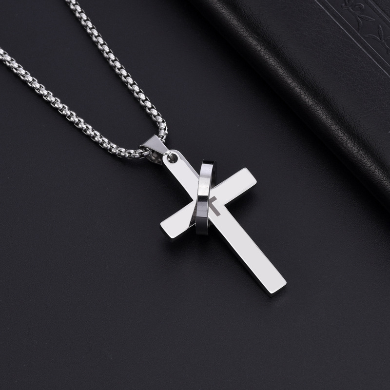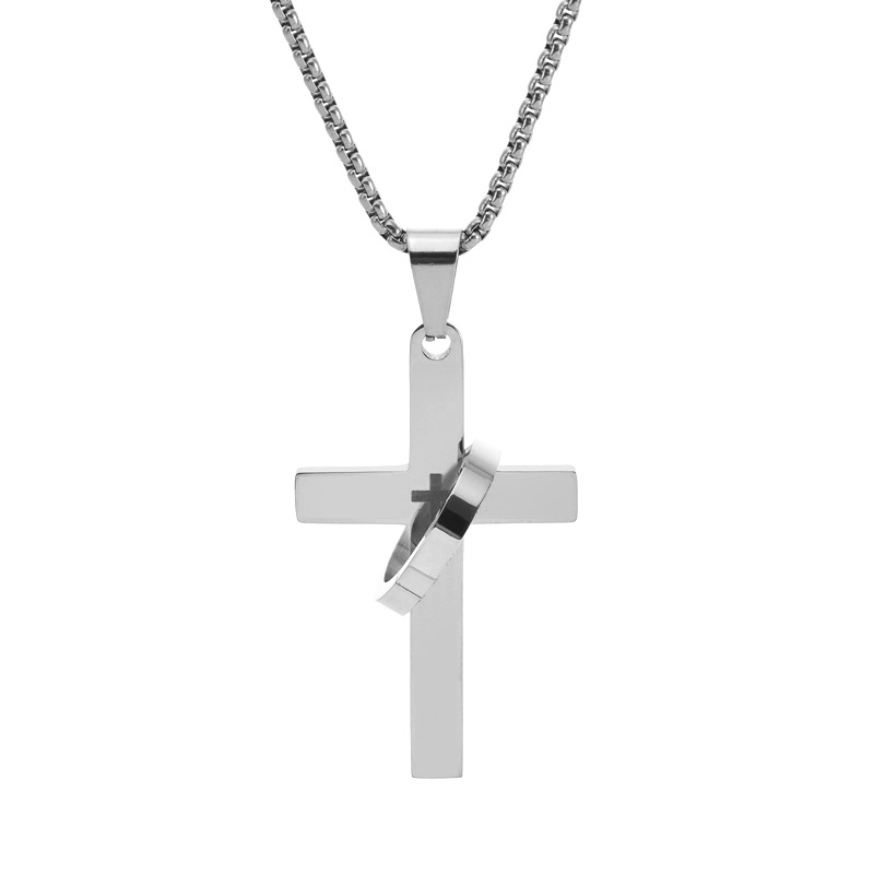 Lantisor barbatesc cu pandantiv in forma de cruce simpla cu inel, otel inoxidabil, placat cu aur, Tessero, argintiu