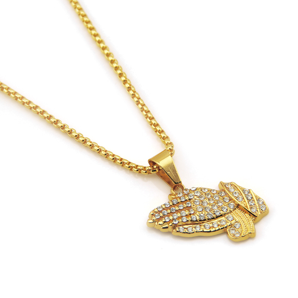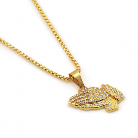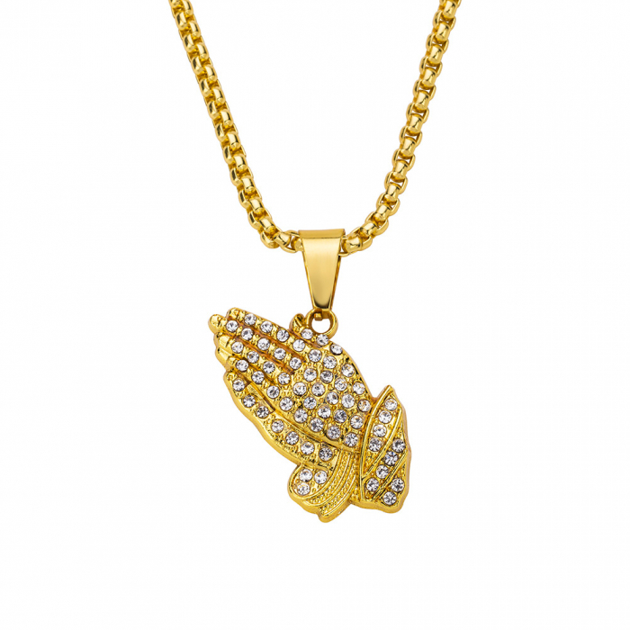 Lantisor cu pandantiv Iced Out. maini in postura de rugaciune, pietre zirconiu, placat cu aur 18K, Tessero, auriu