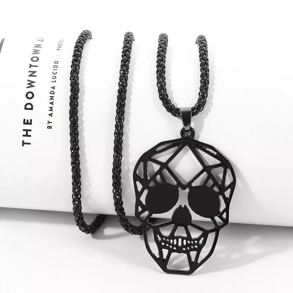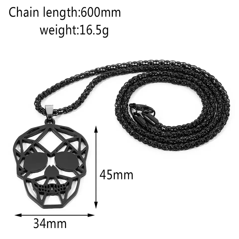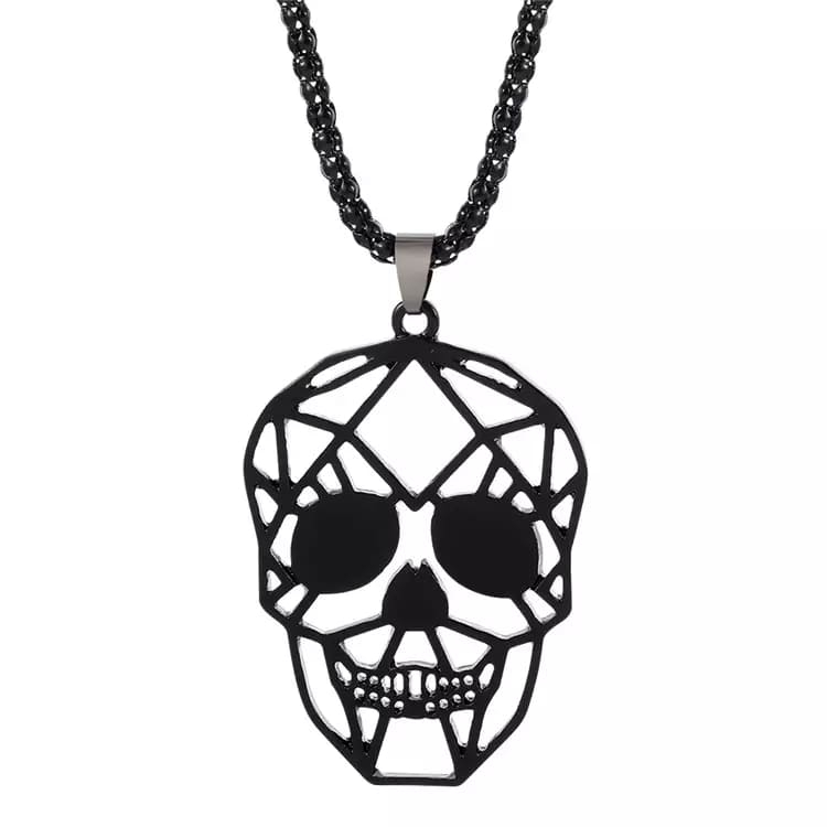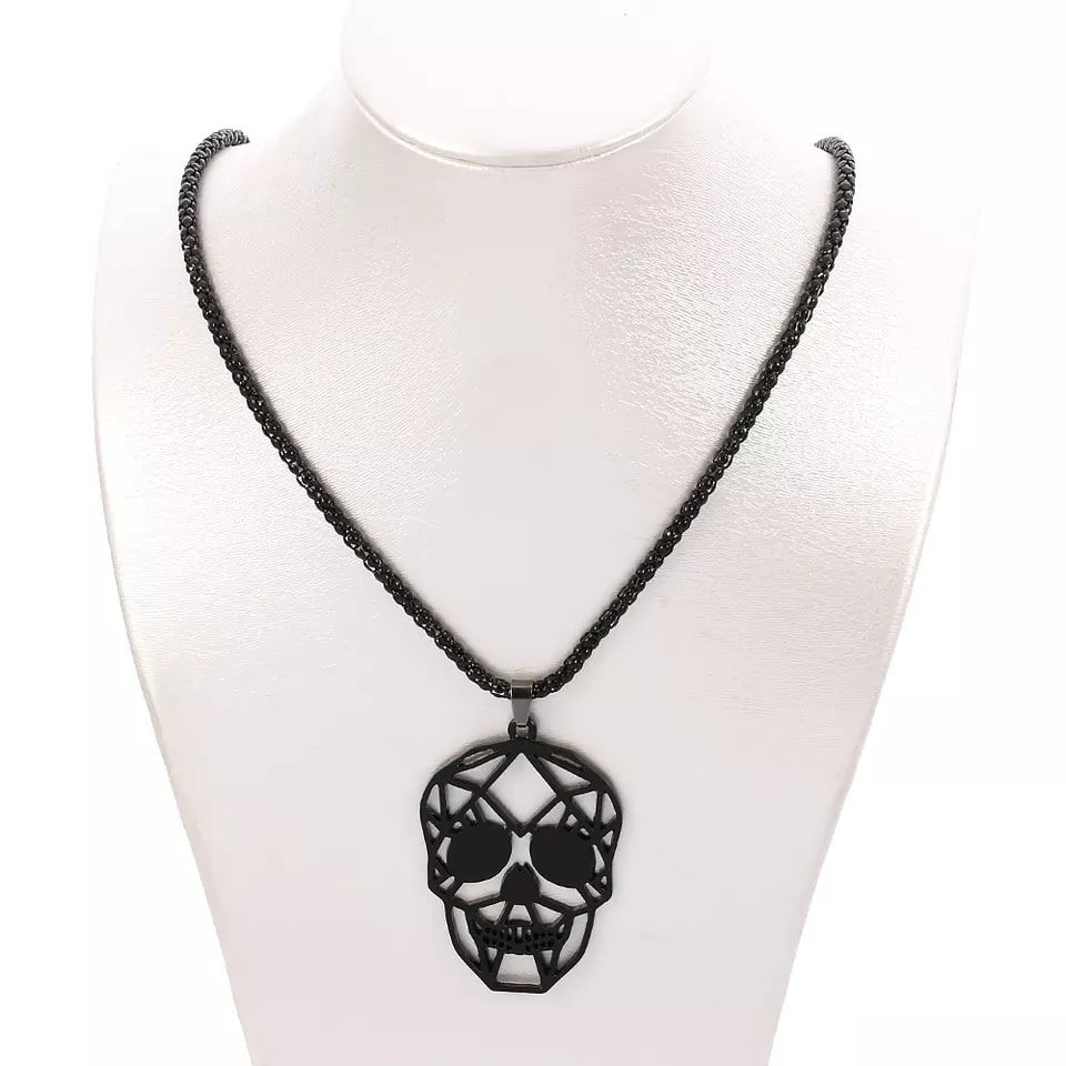 Lantisor design cubic cu pandantiv in forma de cap de mort geometric, otel inoxdabil, Tessero, negru