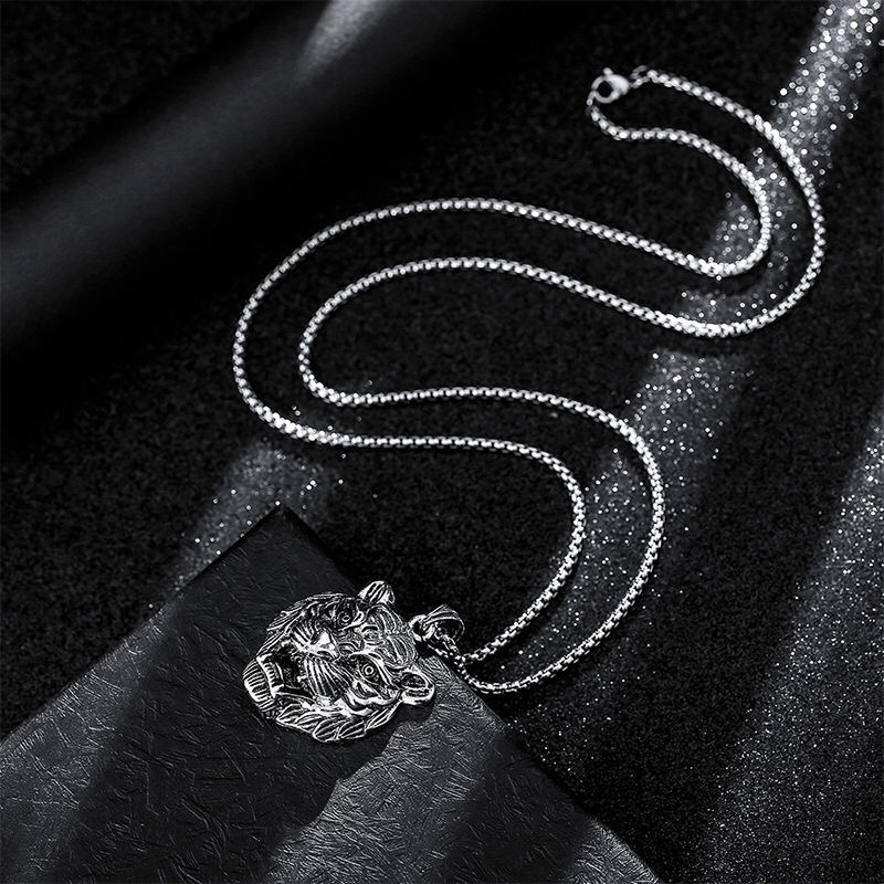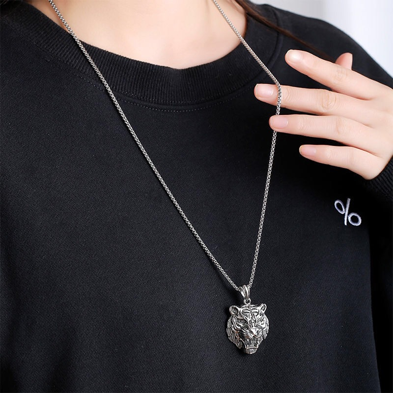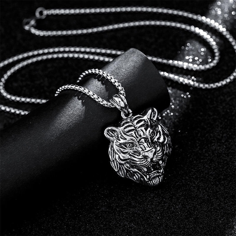 Lantisor design cubic cu pandantiv in forma de cap de tigru, placat cu argint, Tessero, 65 cm, argintiu