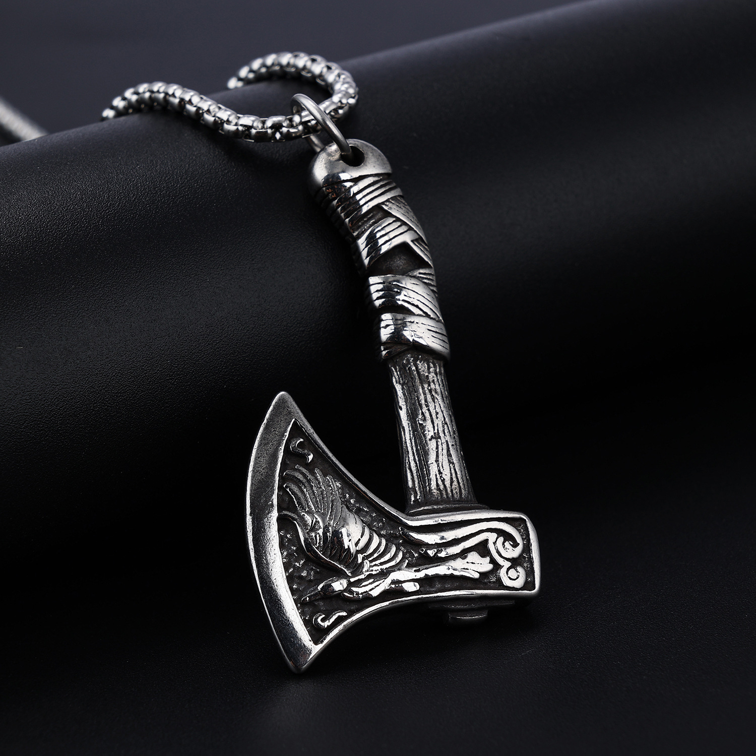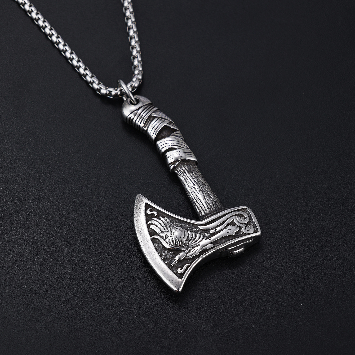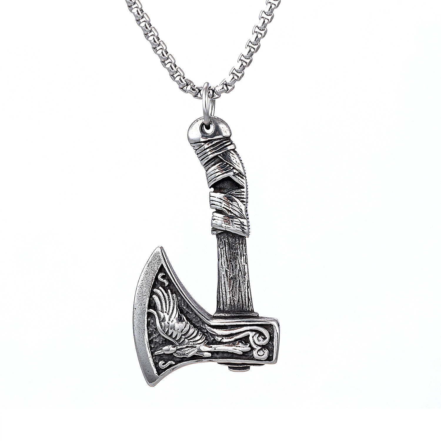 Lantisor design cubic cu pandantiv VIking in forma de topor cu detaliu vultur, otel inoxidabil, placat cu argint, Tessero, 50 cm, argintiu
