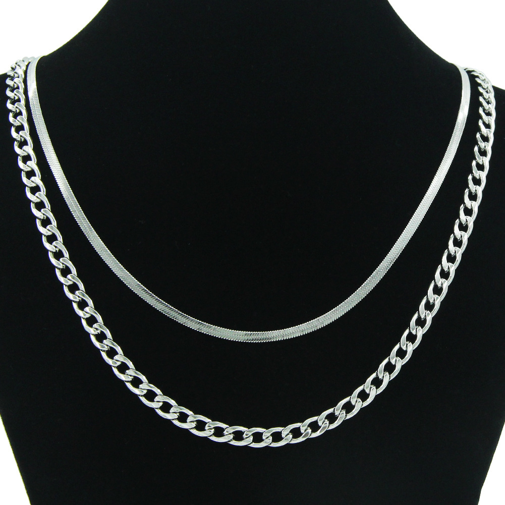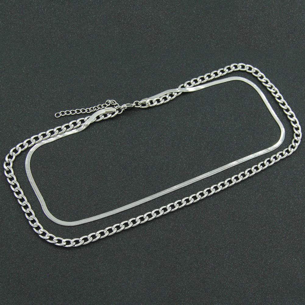Lantisor dublu casual, model Snake si Cuban Chain din otel inoxidabil, unisex, Tessero, extensie reglabila, argintiu