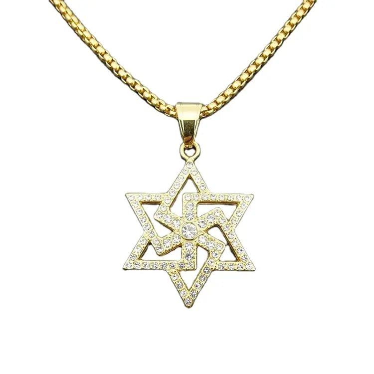 Lantisor Hip Hop design cubic cu pandantiv in forma de stea hexagonala, otel inoxidabil, placat cu aur 18K, pietre zirconiu, Tessero, auriu