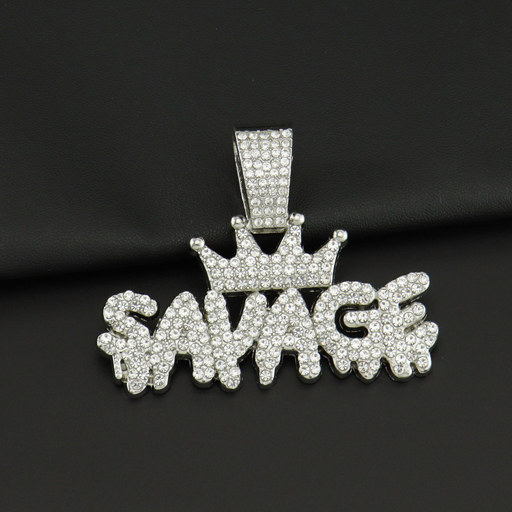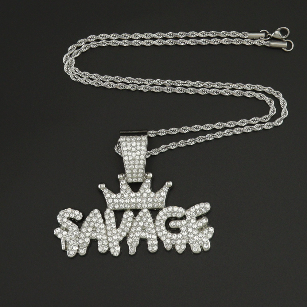 Lantisor model Rope cu pandantiv Hip hop in forma de coroana cu inscriptie " Savage ", placat cu aur 18K, pietre zirconiu, Tessero, argintiu