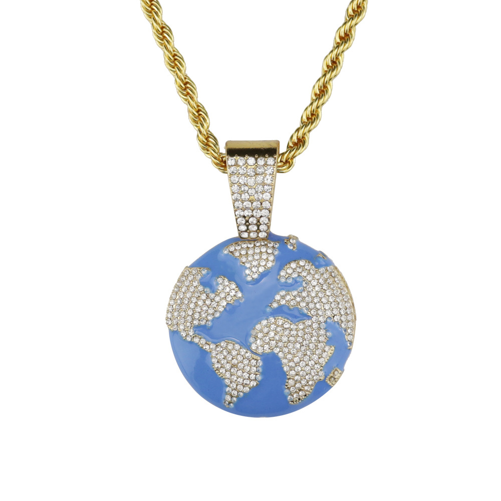 Lantisor model Rope cu pandantiv Hip hop in forma de glob pamantesc, placat cu aur 18K, pietre zirconiu, Tessero, auriu