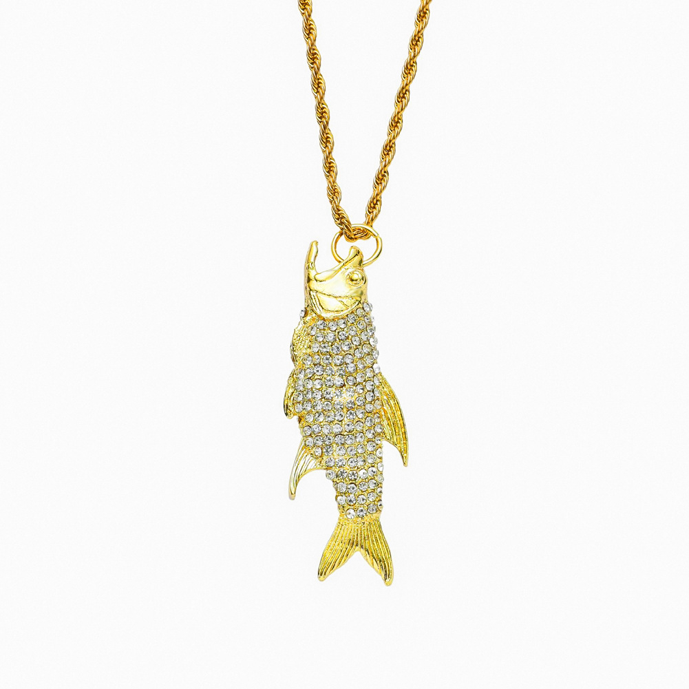 Lantisor model Rope Hip Hop cu pandantiv Iced Out in forma de peste, pietre zirconiu, otel inoxidabil placat cu aur 18K, Tessero, auriu