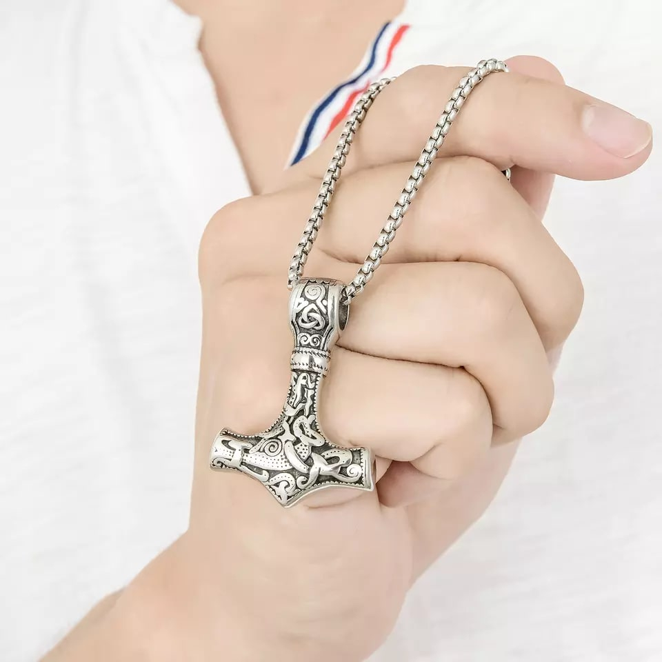 Lantisor Viking design cubic cu pandantiv in forma de ciocanul lui Thor, otel inoxidabil, Tessero, argintiu