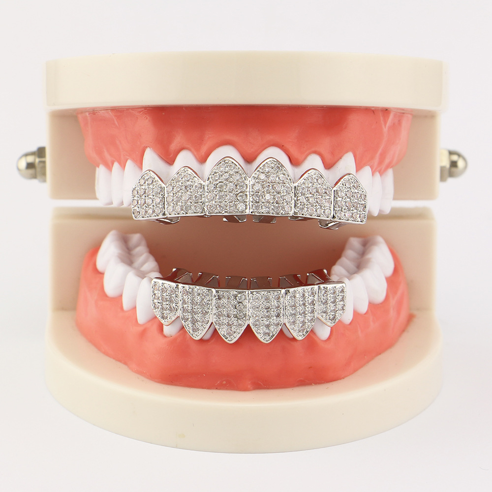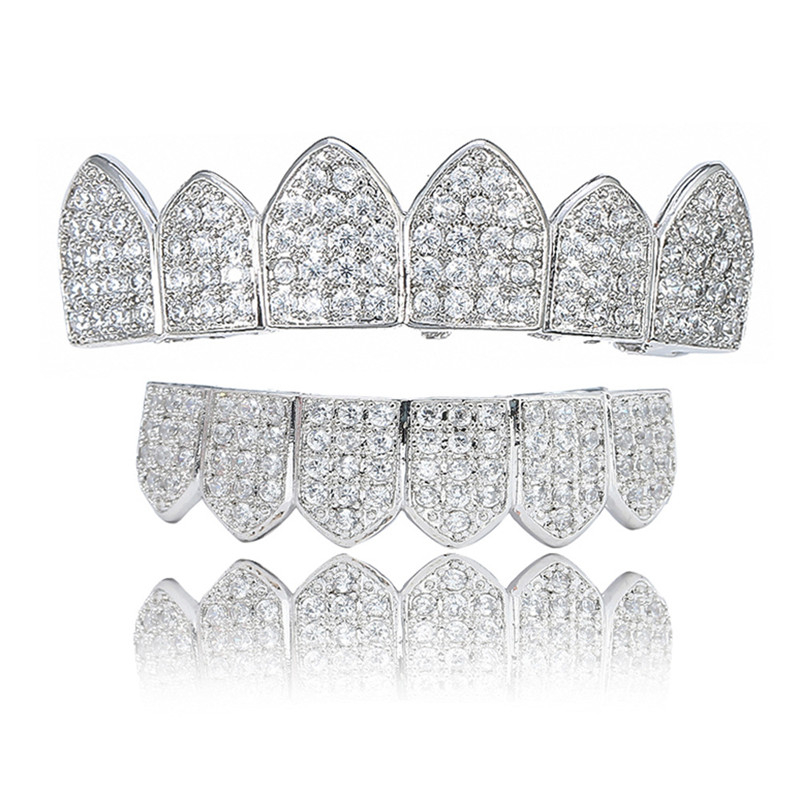 Set de doua fatete pentru dinti, superior si inferior, model Grillz Hip Hop, Iced Out, pietre zirconiu, placate cu aur 18K, argintiu, Tessero