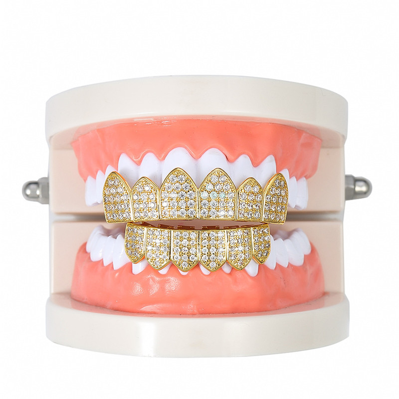 Set de doua fatete pentru dinti, superior si inferior, model Grillz Hip Hop, Iced Out, pietre zirconiu, placate cu aur 18K, auriu, Tessero
