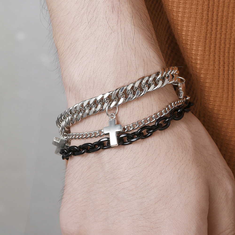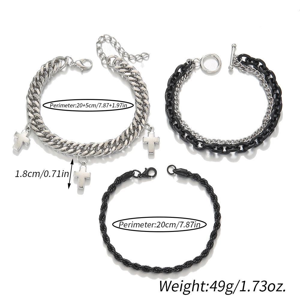 Set de trei bratari din otel inoxidabil, model cu cruce, cuban chain, rope, Tessero, argintiu si negru
