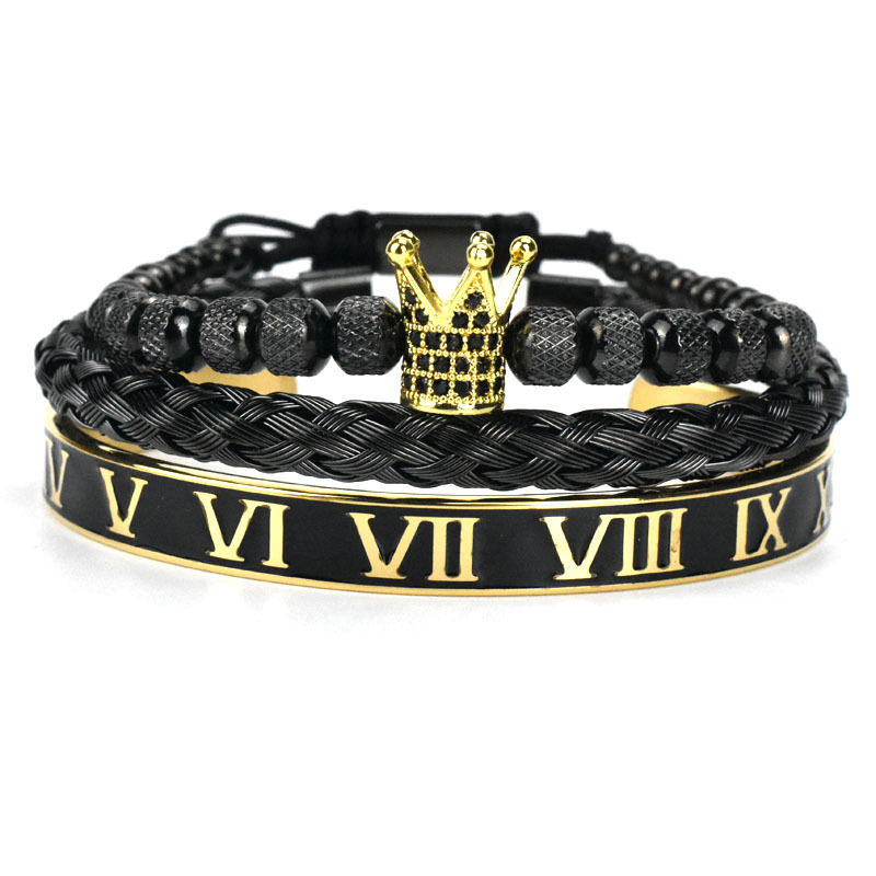 Set de trei bratari luxury, bilute din otel inoxidabil, model cu coroana si cifre romane, placat cu aur, marime universala, Tessero, negru