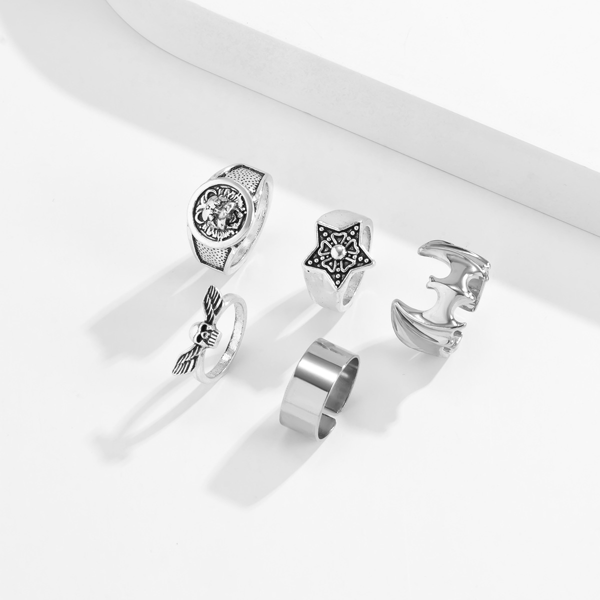 Set format din 5 inele diferite modele Punk, unisex, batman si cap de mort, placate cu argint, marime reglabila, Tessero, argintiu