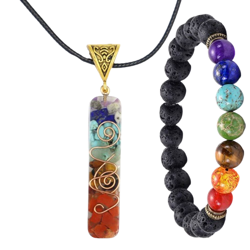 Set lantisor cu piatra hexagonala si bratara energetica 7 Chakre din roca vulcanica, vindecare si stare de bine, negru, unisex, Tessero