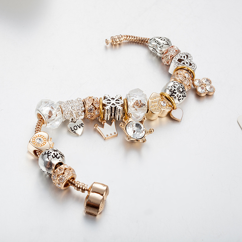 Bratara de dama cu 18 charm-uri diferite modele, model cu coroana, placat cu aur 18K, inchidere clips, marime 18 cm, lant de siguranta, Tessero, auriu