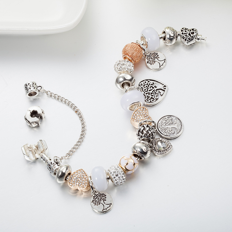 Bratara de dama cu 22 charm-uri diferite modele, model cu copacul vietii, placat cu argint, inchidere clips, marime 18 cm, lant de siguranta, Tessero, argintiu