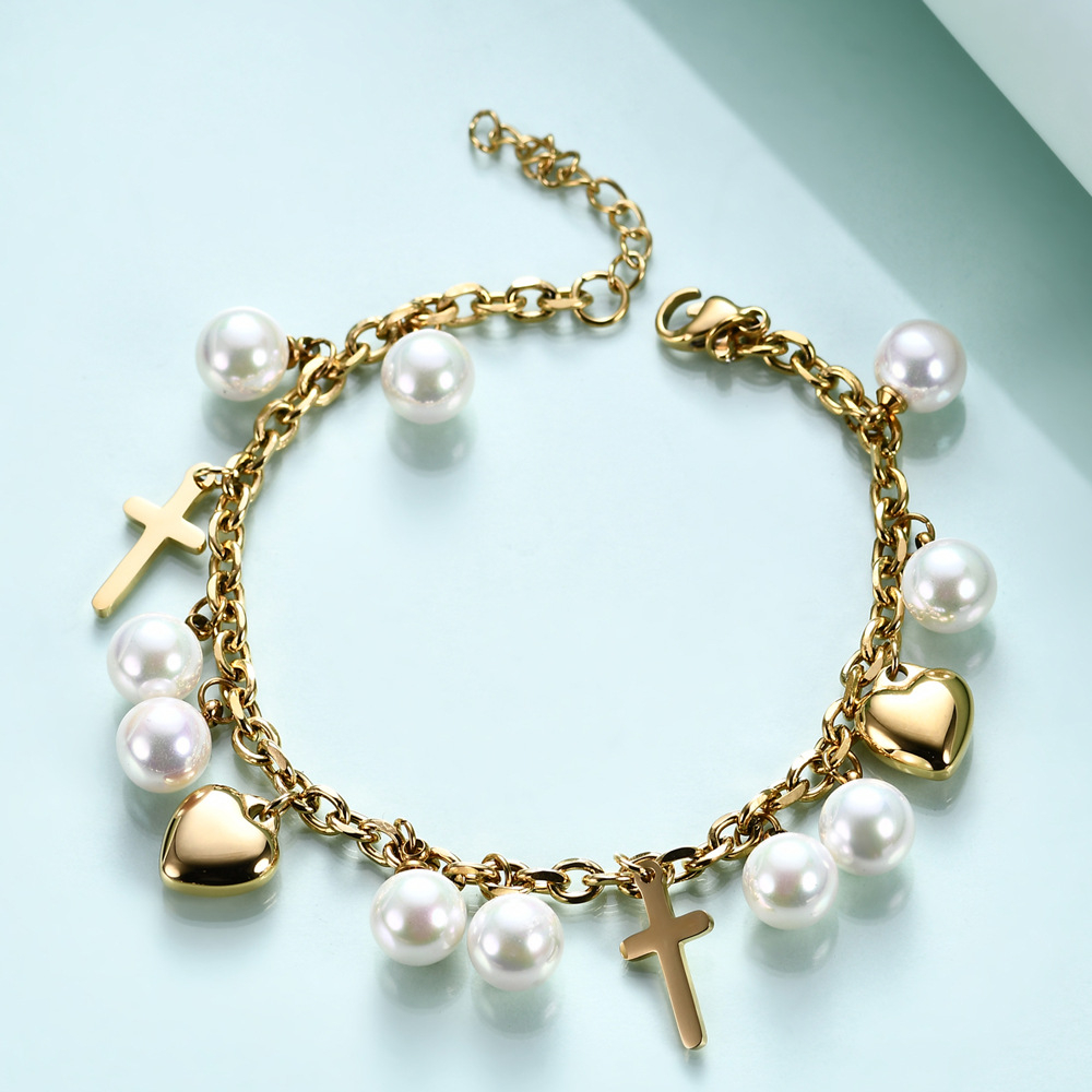 Bratara de dama cu charm-uri in forma de cruce si inima, perle naturale, placat cu aur 18K, otel inoxidabil, reglabila, Tessero, auriu