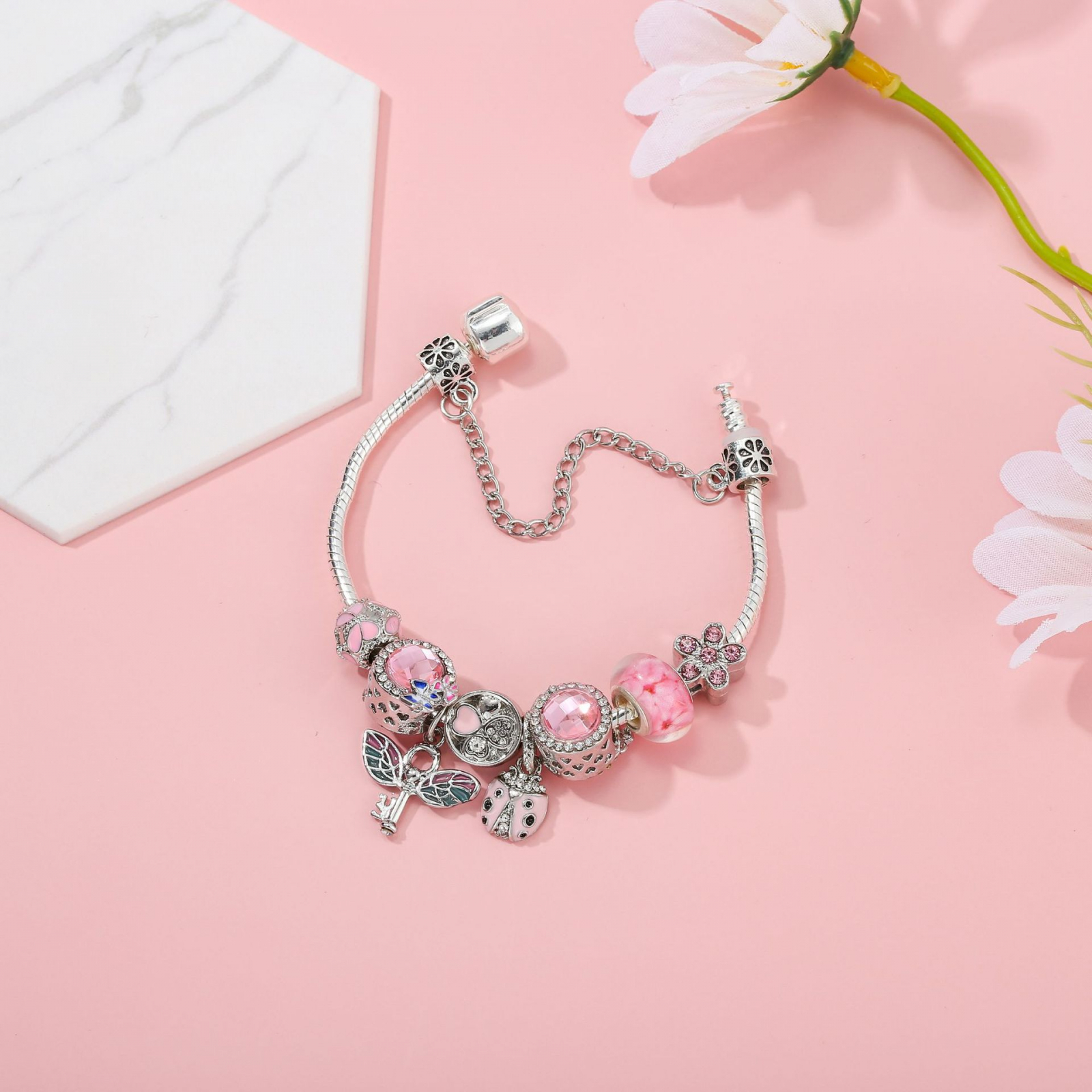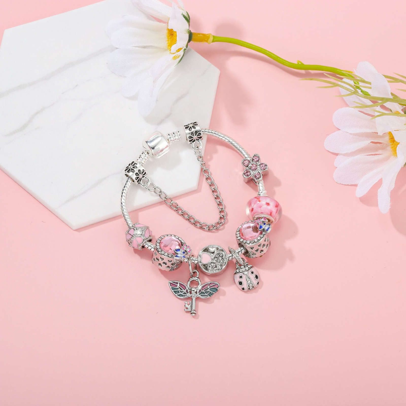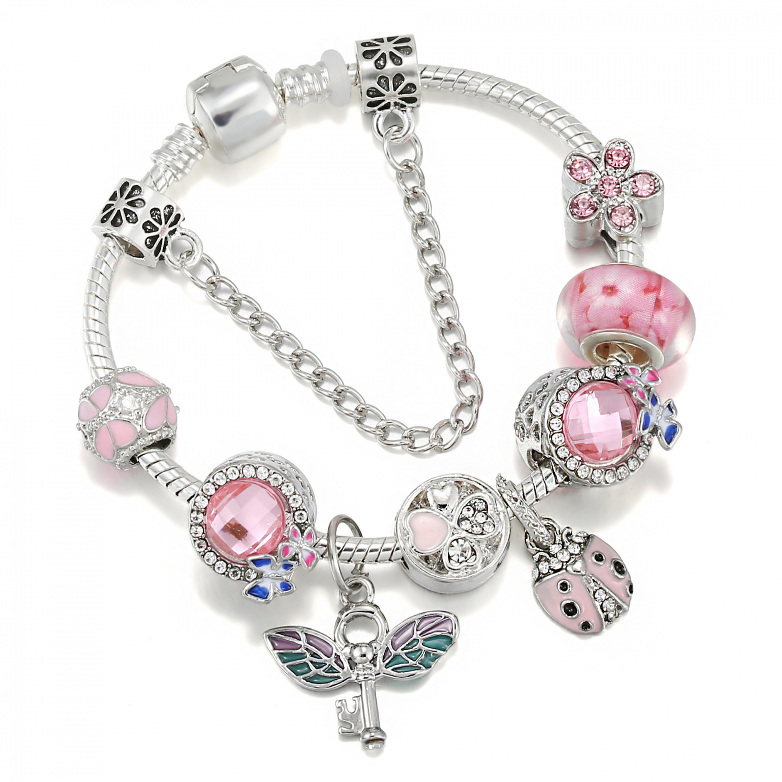 Bratara de dama cu charm-uri, model in forma de buburuza si cheita cu aripi, placat cu argint, inchidere clips, lantisor de siguranta, marime 18 cm, Tessero, argintiu si roz