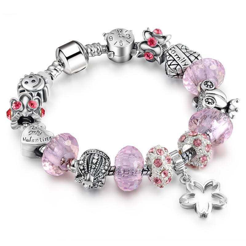 Bratara de dama cu charmuri, 15 talismane, placata cu argint, marime 18 cm, roz, Tessero