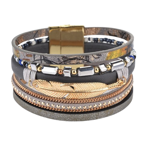Bratara de dama din piele naturala cu multiple siraguri, model cu pana, prinde cu magnet, pietre zirconiu, Tessero, negru