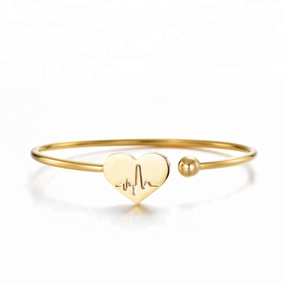 Bratara de dama tip Bangle flexibila, model electrocardiograma, inimioara cu puls, placata cu aur 18K, otel inoxidabil, auriu