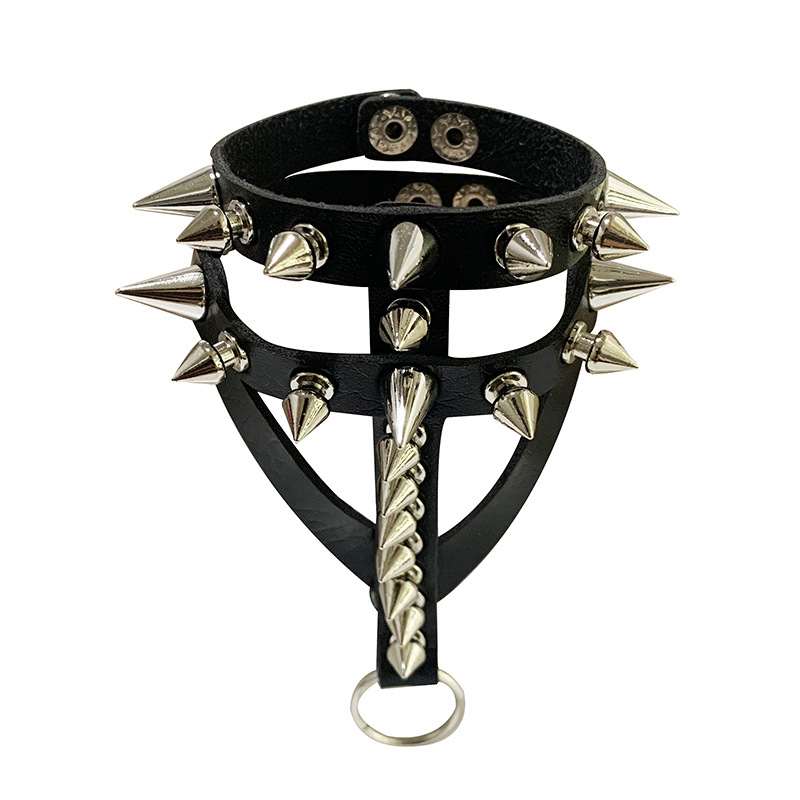 Bratara din piele naturala pentru toata mana, model Punk cu tinte si inel, unisex, marime reglabila, negru, Tessero