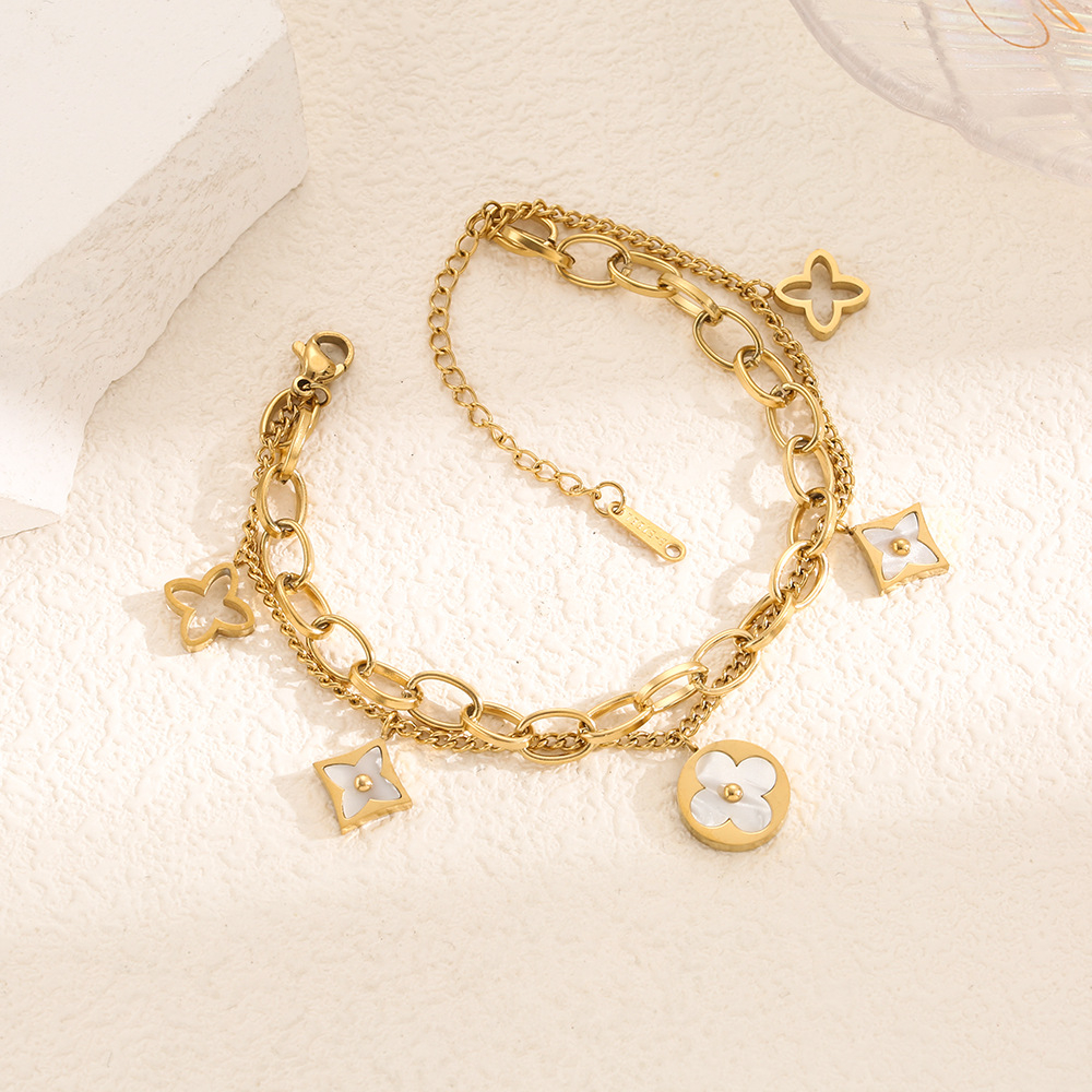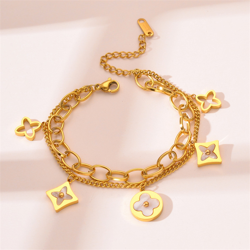 Bratara dubla model tip lant cu charm-uri in forma de trifoi, otel inoxidabil placat cu aur 18K, marime reglabila prin extensie, Tessero, auriu