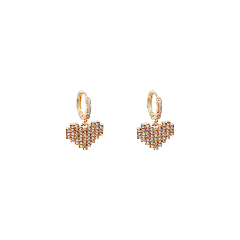 Cercei de dama cu strasuri in forma de inima pixelata, placat cu aur 18K, model rain drop, pietre zirconiu, auriu