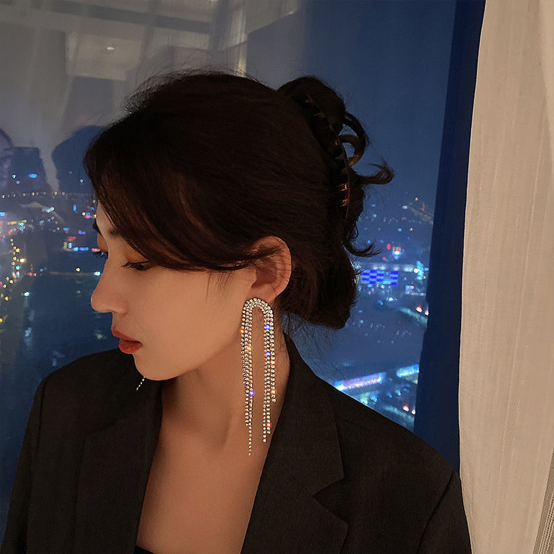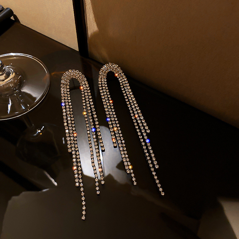 Cercei de dama lungi cu model in forma de arcuit, decorate cu strasuri din pietre zirconiu, placat cu aur 18K, Tessero, argintiu