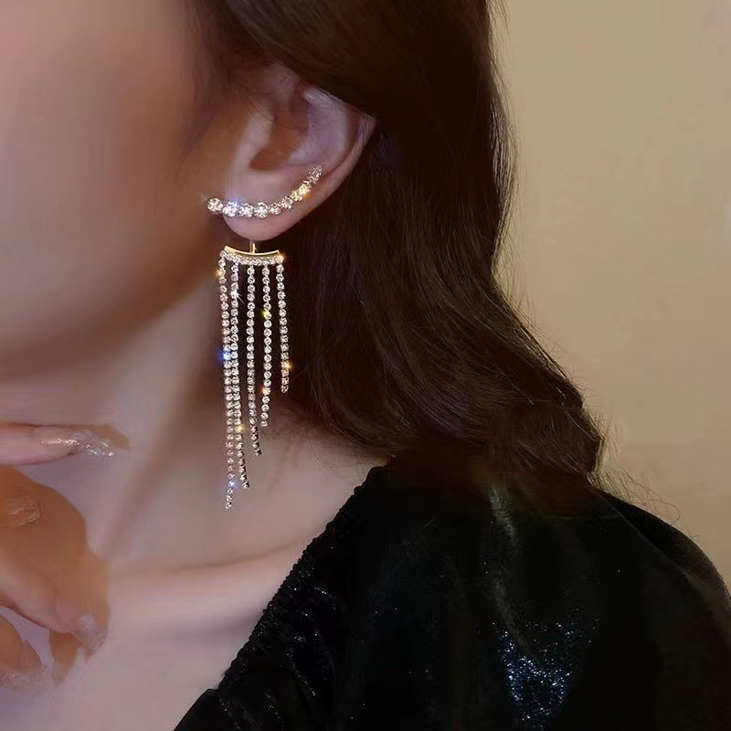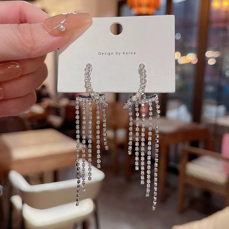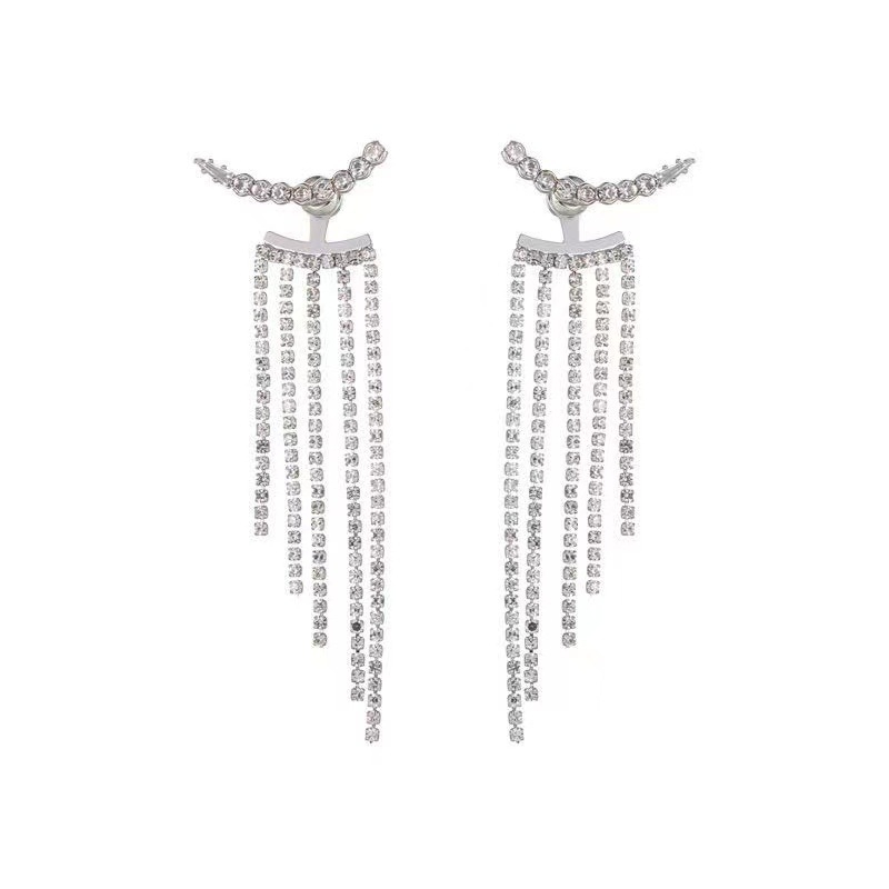 Cercei de dama lungi cu strasuri din pietre zirconiu, placat cu aur alb 18K, Tessero, argintiu