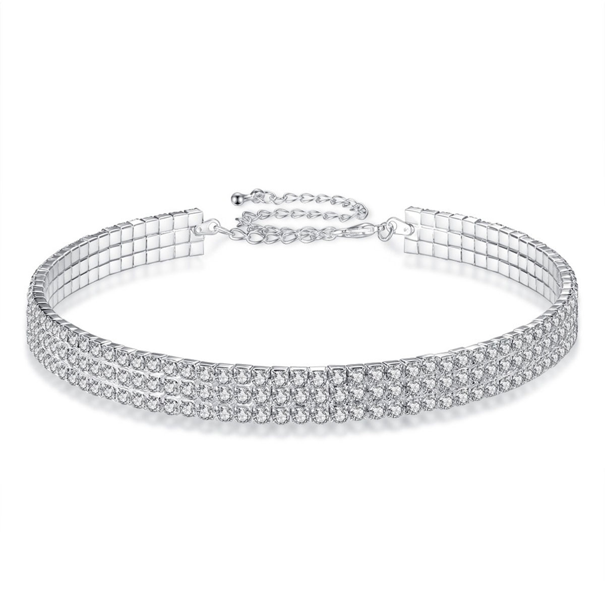 Colier de dama tip Tennis cu trei randuri, strasuri din pietre zirconiu, placat cu aur 18K, Tessero, argintiu