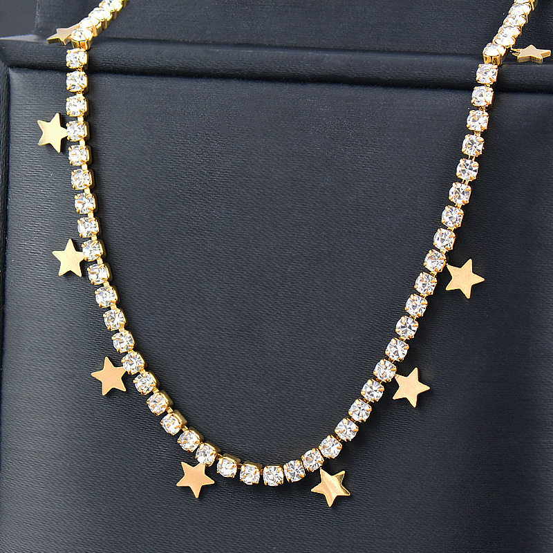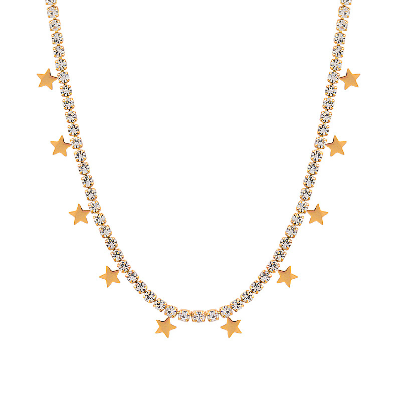 Colier model tip Tennis cu cham-uri in forma de stelute, pietre zirconiu, otel inoxidababil, placat cu aur 18K, inchidere clips, 45 cm, Tessero, argintiu
