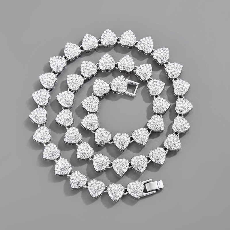 Colierul Tessero este un accesoriu de inalta calitate, ideal pentru oricine iubeste bijuteriile elegante si rafinate. Acesta este un colier tip Tennis, cu modele in forma de inimioara, decorate cu pietre zirconiu stralucitoare. Este placat cu aur alb de 18K, ceea ce ii confera un aspect sofisticat si pretios.