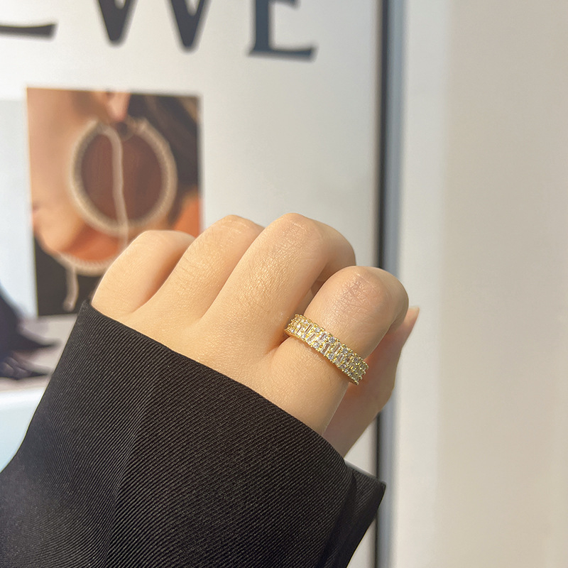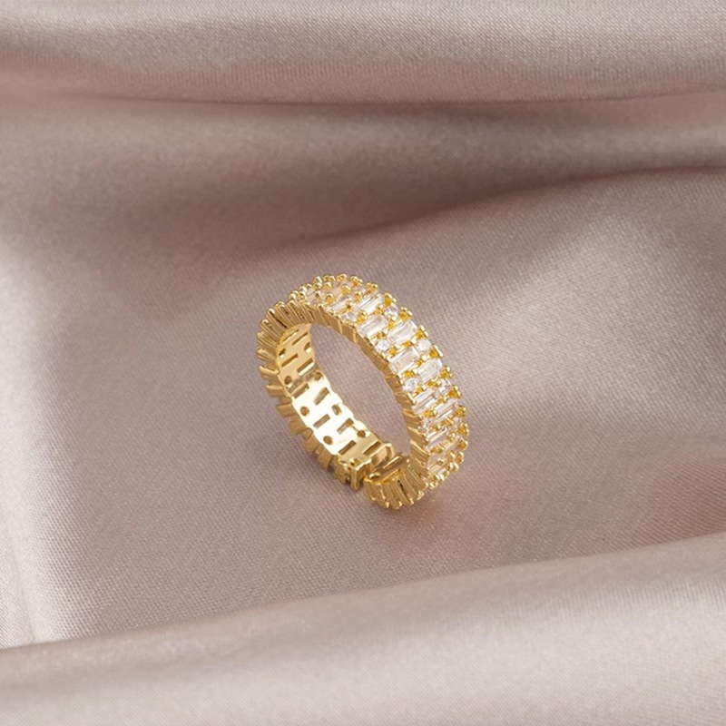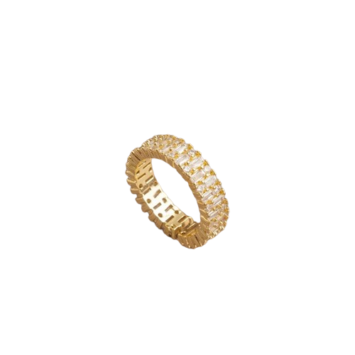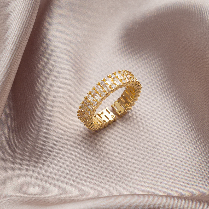 Inel de dama, model Tennis cu pietre zirconiu, taietura dreptunghiulara, placat cu aur 18k, marime reglabila, Tessero, auriu