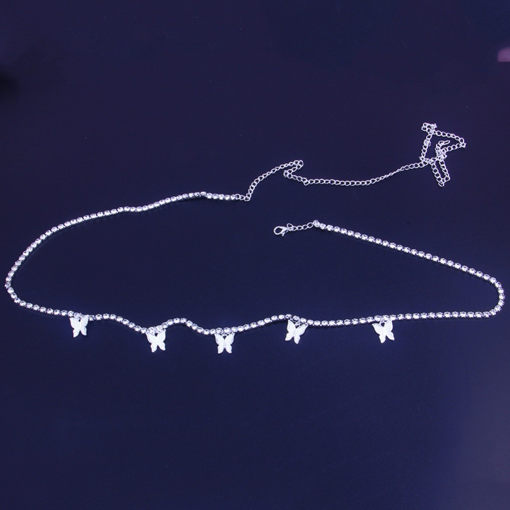 Lant bijuterie pentru corp cu model fluturi, pietre zirconiu, extensie reglabila, argintiu, Tessero